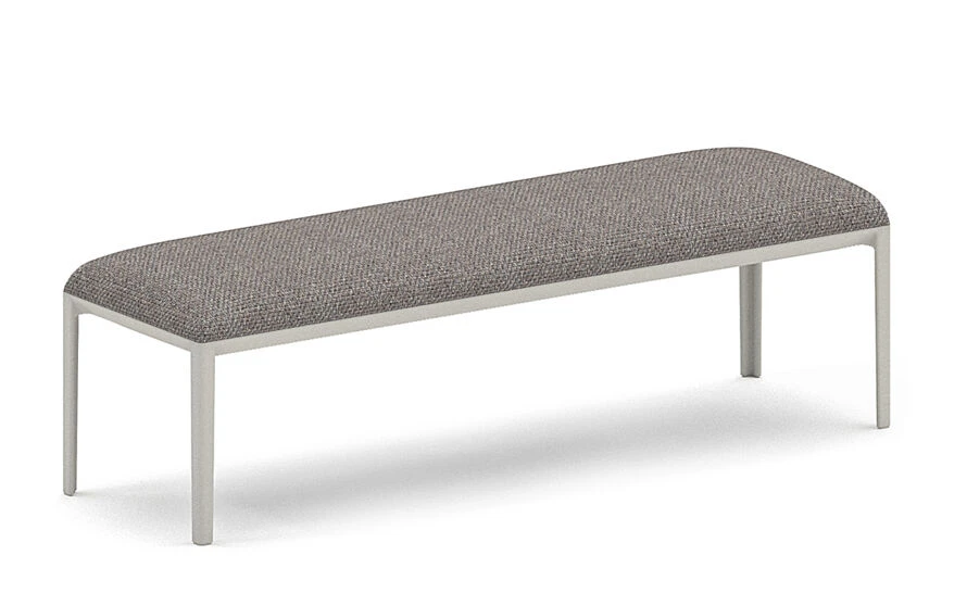 The immense strength of the cast aluminum legs produces lengthy bench proportions, that augment the airy effect of the chamfered border edges. Available in a curated selected of exterior rated fabrics to complement or contrast the sand gray finish of the bench legs.