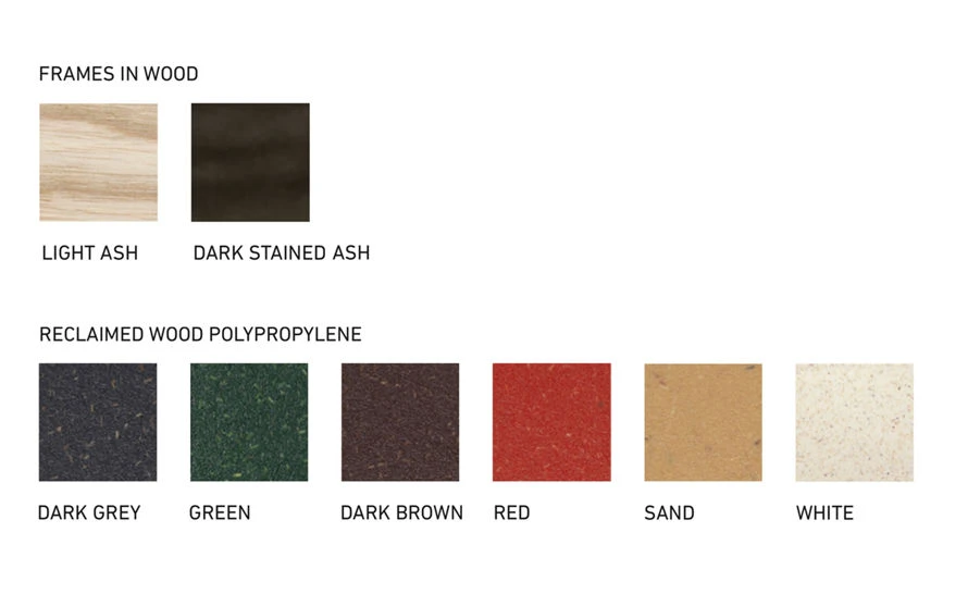 Please note: The seat is made from 100% reclaimed materials – polypropylene mixed with wood fiber. The wood particles create a speckled texture that gives the surface a warmer, more natural touch. Lighter colors show the contrast of wood fibers more. Optional upholstered slipcover is not suitable for the Alfi armchair.