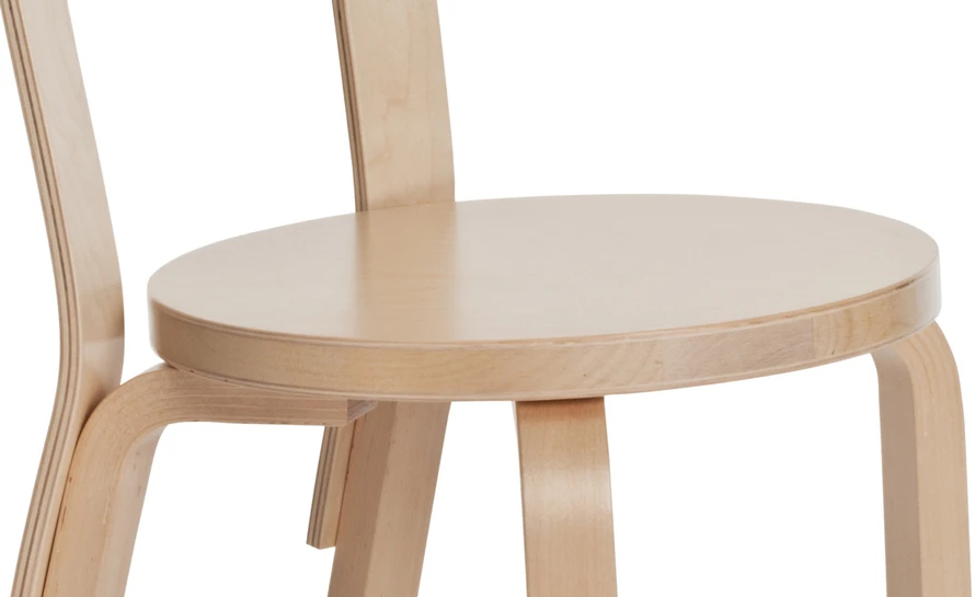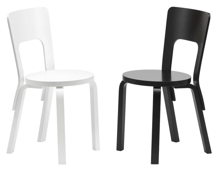 Chair 66 features natural lacquered birch legs and backrest, the seat is available in your choice of birch veneer, black linoleum or white laminate. Chair 66 is also offered with an all lacquered finish.