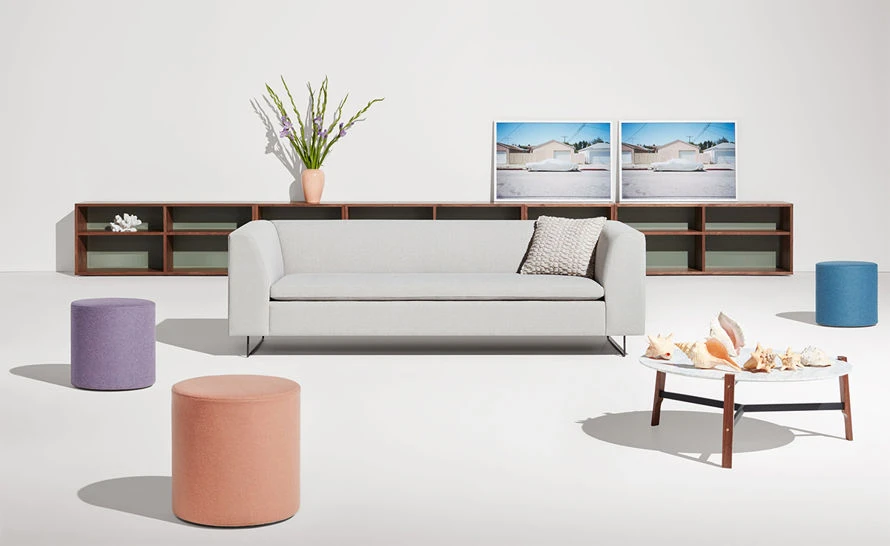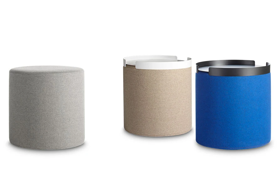 Playful geometry gets to work. Use the Bumper small ottoman as side table, foot stool, flexible seating, or to practice log rolling (well, maybe not). Leather or soft felted wool blend upholstery is available in boatloads of colors. Top it off with the powder-coated steel Bumper Tray for a more stable and spill-friendly surface.