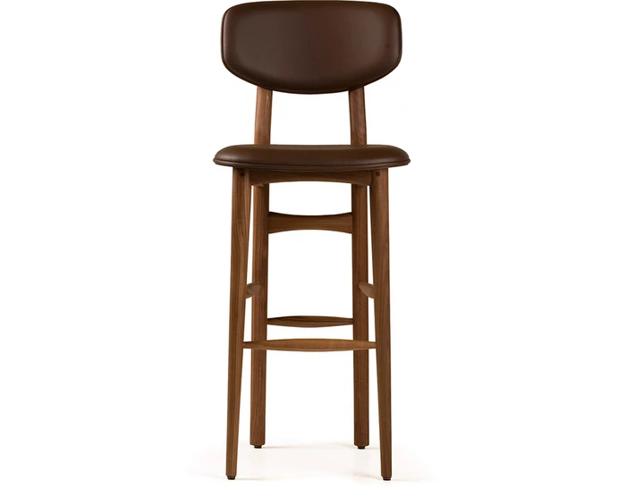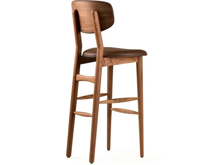 The timber backrest wraps around this elegant upholstered bar stool as the wings of a butterfly. Designed by Autoban and manufactured by De La Espada for the Autoban brand.