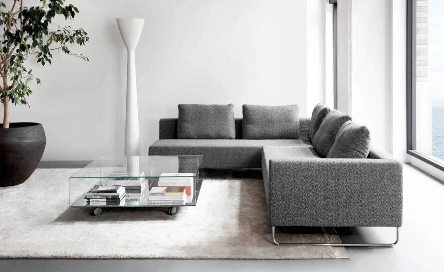 Canyon incorporates new construction processes and manufacturing procedures. Conventional sofas are assembled using wood frames onto which springs can be mounted and fabric stapled. In contrast, Canyon combines a welded steel frame with contoured foam, woven synthetic strapping and removable or replaceable covers. Canyon’s welded steel frame allows it to endure longer than conventional wood framed seating. The steel frame is designed to have the same structural integrity when combined with multiple pieces. A woven suspension system used in the automotive industry is uniquely attached to the steel frame, adding superior support while creating a lighter appearance.