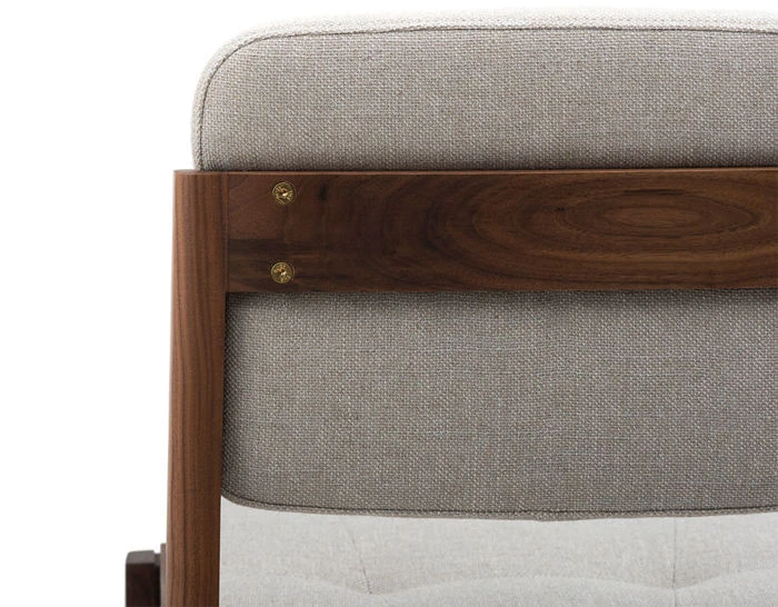 Available in American black walnut, American white oak, or European Ash in a range of finishes, and a range of fabrics. Armchair has leather belting strap arms in black or brown with brass-colored PVD detailing.