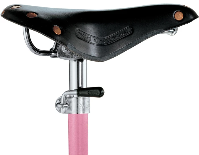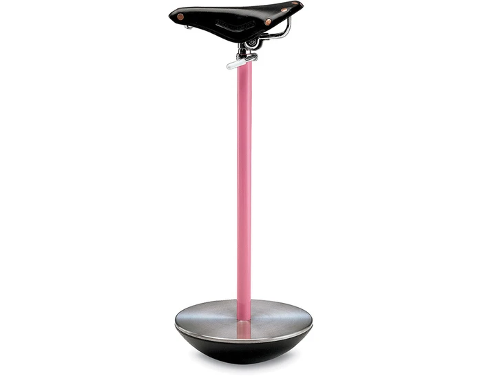 Sella features a black saddle of a racing bicycle with a pink lacquered steel column on top of a cast-iron base.