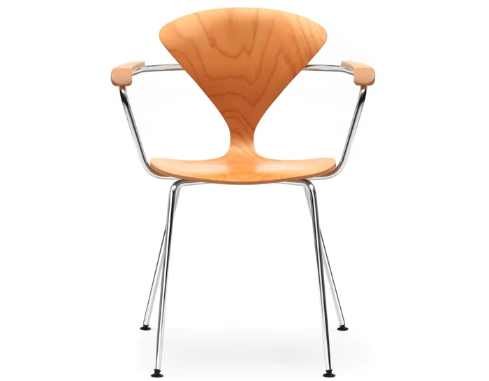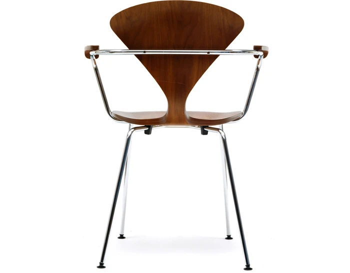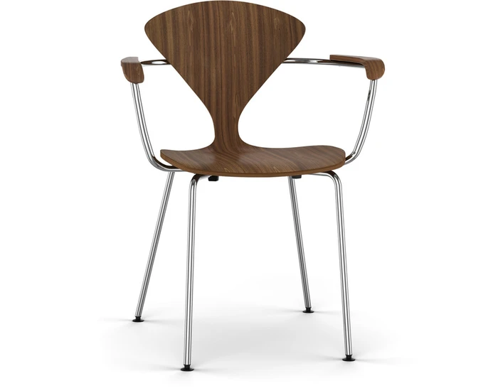 The Cherner Chair is still regarded as one of the most dramatic designs utilizing the technology of molding plywood. Like the 1958 original, the Cherner stacking chair utilizes a molded plywood beech core seat with a unique construction of laminated plywood in graduated thickness with face veneers in beech or walnut. The seat and back are designed using a single shell connected by a slim and sturdy throat with slender metal legs. Each chair is manufactured from the original drawings, molds and specifications by Cherner Chair, a Cherner family company headed by the designer’s sons.