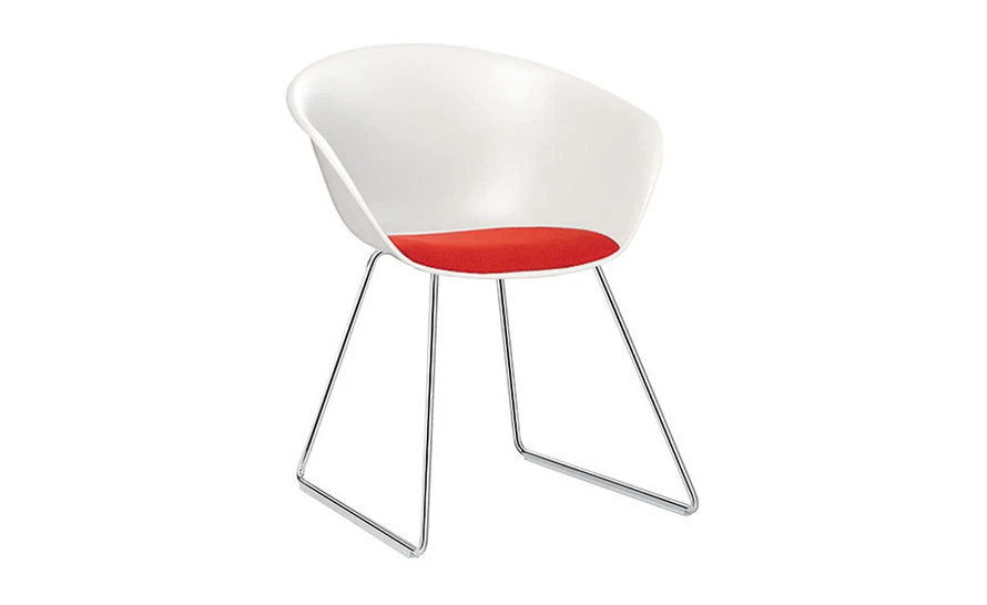 Chair with chromed steel sled base and polypropylene shell available in six colors. The seat cushion can be upholstered in leather, faux leather or fabric applied on the seat surface. Optional glides for wood floors may also be specified.
