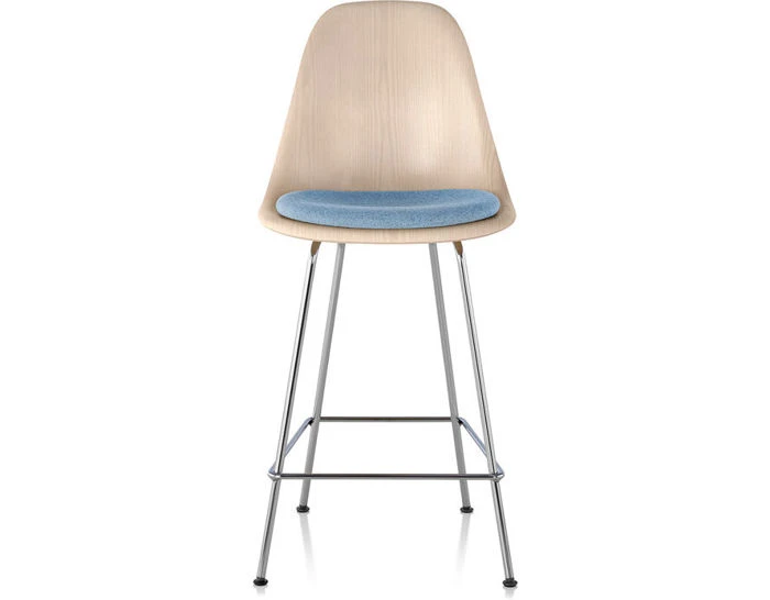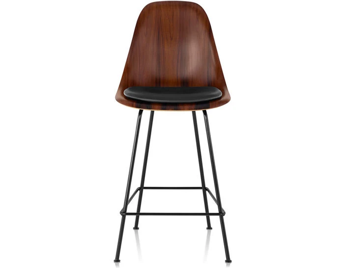 The authentic form of the Eames stool is the result of a process that gives wood veneer the extra flexibility it needs to be molded into the complex curves of a single-from wood shell. The result brings a touch of style to any setting. Eames Molded Wood Stools are available in several veneers. The 4-leg base comes in bar- or counter-height, and offers its own choice of finish options. Black and chrome 4 leg stools have black glides while the white stool has white glides. The upholstered seat pad comes affixed to the Eames molded shell and available in a variety of fabric or leather options.