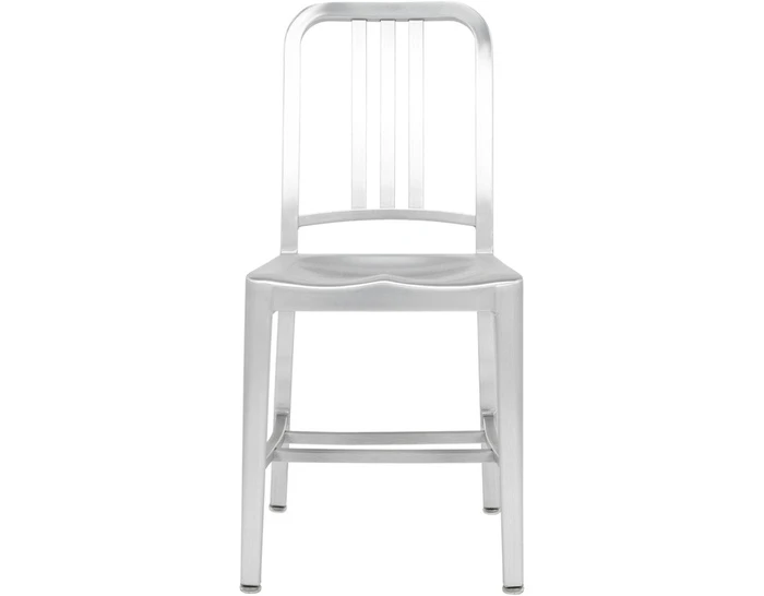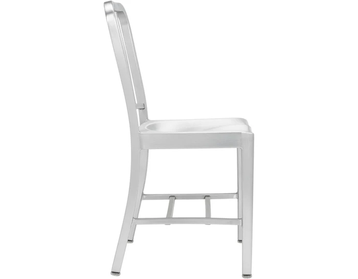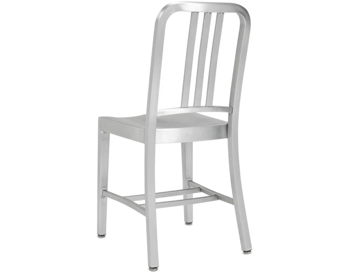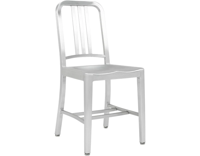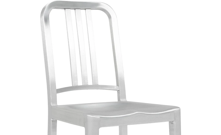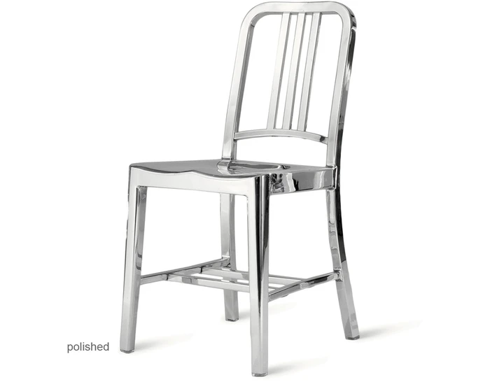 The Emeco navy chairs feature recycled aluminum in a brushed or hand-polished finish. The brushed version is suitable for outdoor use while the polished finish is only recommended for protected outdoor environments. The chairs come standard with soft plastic (TPU) glides but can also be specified with other options. Optional seat pads can be specified in Maharam Ledger vinyl or recycled PET felt post-consumer recycled content and a non-slip backing.