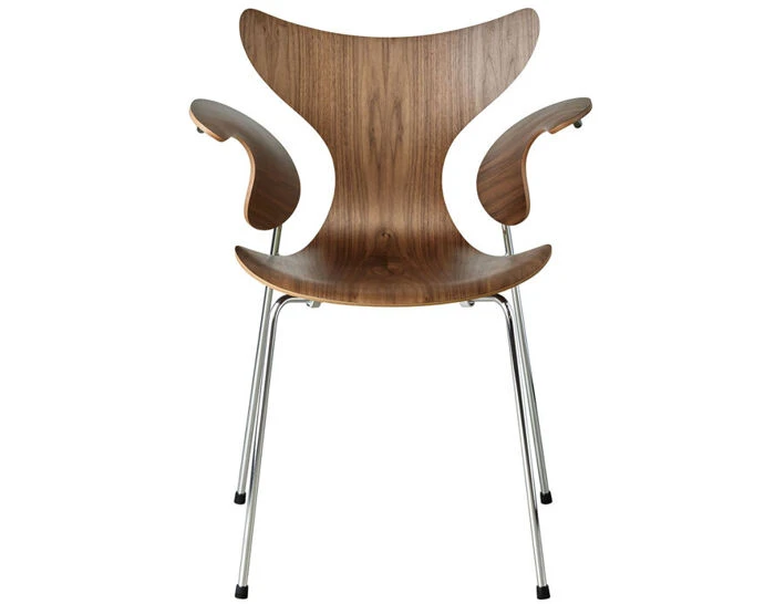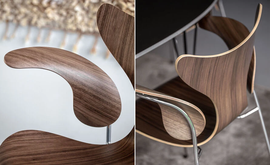 The Lily chair is available in two versions: with or without arms. Both versions come in a natural walnut veneer or fully upholstered in a wide range of fabrics and leathers. The shell is made of pressure molded sliced veneer and the base comes with 4 legs made of chromed steel tubes.