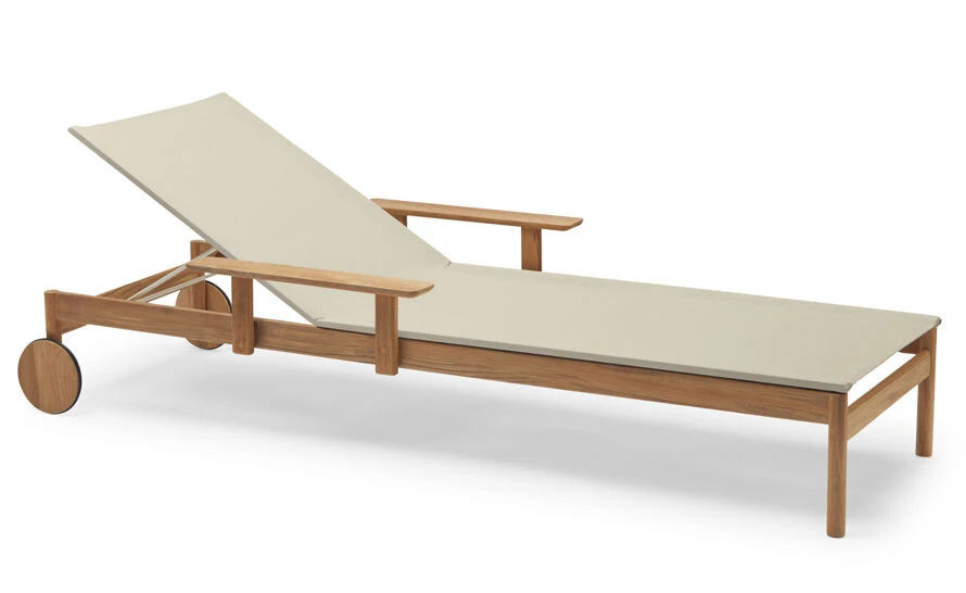 Pelagus Sunbed is intended for pure relaxation and aesthetic pleasure derived from its distinctive yet understated design language, a spirit imbued in the entire Pelagus collection. Supremely comfortable and flexible, the sunbed can be set into 5 positions, for lying down, reclining or sitting. The well-crafted wooden frame is expressive yet simple, its archetypal wooden wheels making it easy to move and follow the sun. The weatherproof Sling fabric seat brings a modern edge with its lightness and transparency.
