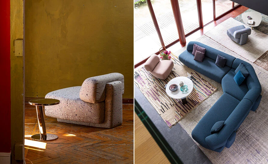 Just like in rock sculptures, where stones maintain their balance by being carefully positioned and interlocked, it is the shape that maintains the balance between the elements on the Gogan sofa and armchair, which is not overly regular. By playing around with gravity and balance, we can make normally heavy shapes lightweight.