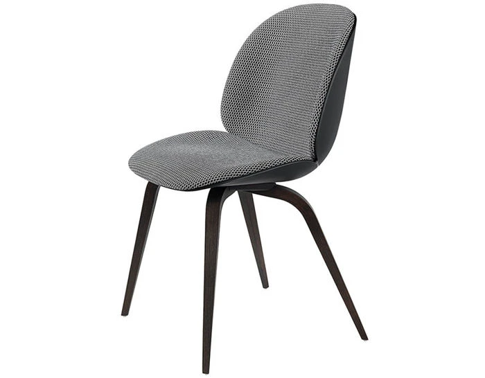 The Beetle front upholstered dining chair with wood base can be specified in a variety of shell colors and upholstery options. Black stained beech, oak or smoked oak finish base. Plastic glides included.