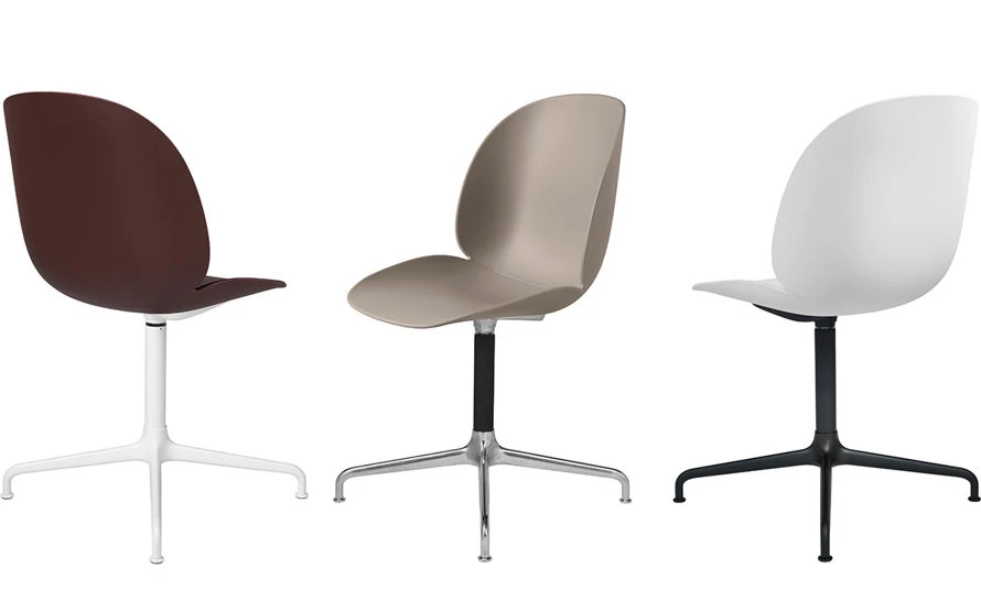 The Beetle chair is available with unupholstered shell or seat upholstered shell in seven colors. Black or black/polished aluminium swivel base. Plastic glides included, felt glides available on request. Beetle is also available in a variety of different configurations. Not stackable.