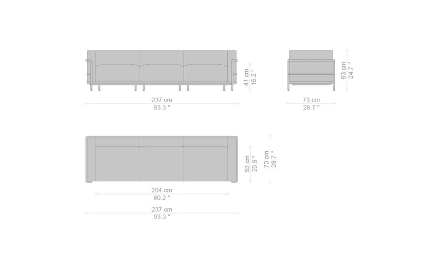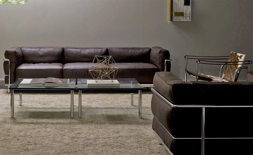 The LC3 features four unconnected cushions, enclosed in a painted or chrome steel tube cage that constitutes the primary support system. The separation of the metal frame and the cushions expresses a rationalist approach to industrial production.