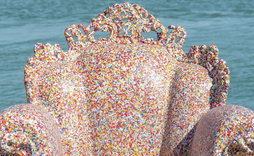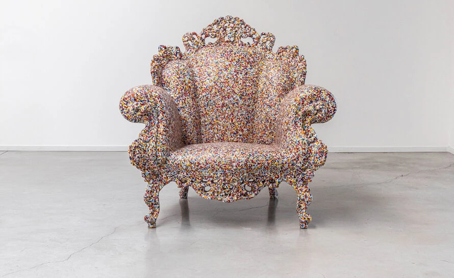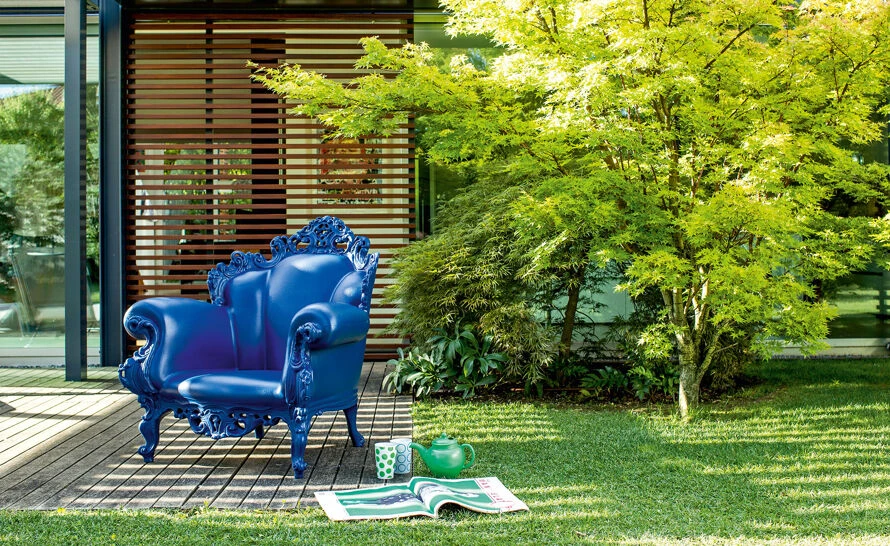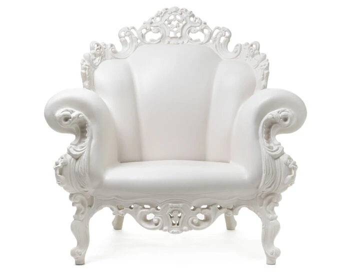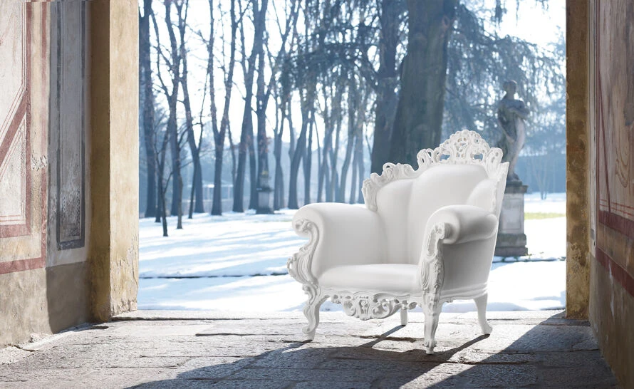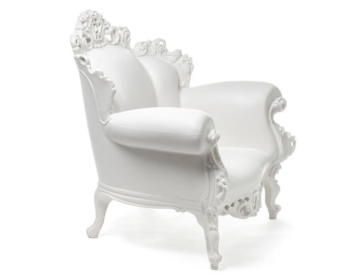 Proust was originally created in 1978 for the Palazzo dei Diamanti in Ferrara. It was immediately recognized as an icon of twentieth century design and one of the most renowned and essential reference points in the quest for form and aesthetic perfection. Mendini used a combination of a mock-antique armchair with a detail from a painting of a garden by French painter Signac. Over the decades it has been reproduced in many different variations including ceramic and bronze versions. Now available in sturdy and durable polyethylene in a mixture of old world aesthetics and new world materials.