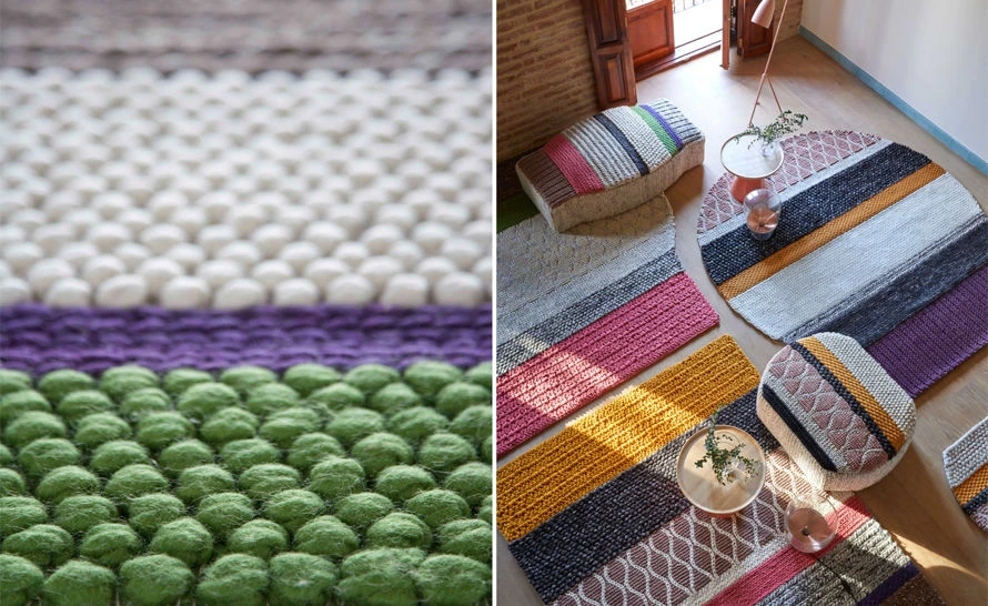 Patricia Urquiola took as aesthetic reference the classic knitted wool sweater, to design a collection with lots of volume that could combine different textures. Some rug models have a very elongated shape and large dimensions, others are of medium or small size. All of them can be combined as if they were modular pieces. In addition, they can also be hung on the wall as a tapestry, and in the case of larger pieces, some can cover part of the floor and the wall at the same time.