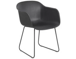 The Fiber armchair shell features an innovative composition with plastic and wood fibers. The wood fiber and plastic blend is injected into the mold, forming the chair’s shell. The shell’s inside can also be upholstered with foam and fabric. The fabric is glued to the shell’s surfaces and stapled using a pipe on the edges. This ensures a smooth and tight surface of the textile. Sled base is powder-coated steel.