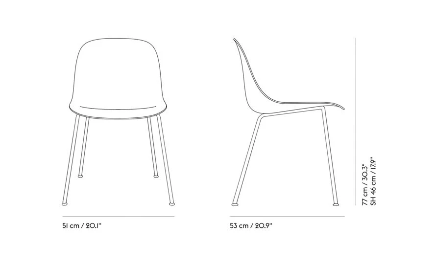 Shell consists of an innovative composition of plastic and up to 25% wood fibers. The wood fiber and plastic blend is injected into the mold, forming the chair’s shell. The Fiber Chair family is made partly from a natural material, meaning that variations in color can occur. For upholstered versions, the shell’s inside is upholstered with foam and fabric. The fabric is glued to the shell’s surfaces and stapled using a pipe on the edges. This ensures a smooth and tight surface of the upholstery. The steel tube base is CNC-bent and powder coated.