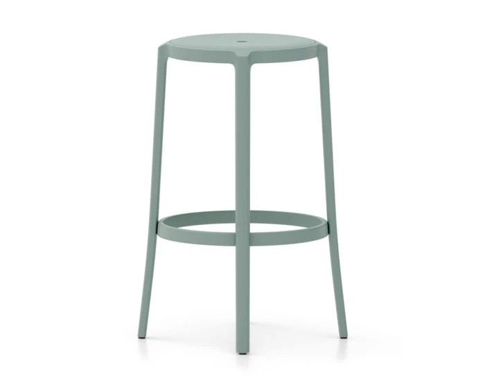 The On and On collection is offered in a variety of seat materials, for different settings and purposes. The rPET seat versions – matching the chair and stool frames – are available in six crisp, timeless colors suitable for both indoor and outdoor spaces. Plywood seats in oak or ash, and upholstered seats, offer a different appeal for interiors. The stools are available in two heights – bar stool height and counter height. Chairs with rPET or plywood seats stack 7 high, and chairs with upholstered seats stack 6 high.