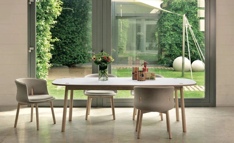 Inspired by the city cars that casually scoot around the streets of Milan, such as the famous Fiat 500, the Peg Chair by Nendo has rounded contours and the back legs in solid ash wood perforate both sides of the backrest. Despite its compact dimensions, the chair’s design provides optimal back support and ideal comfort.