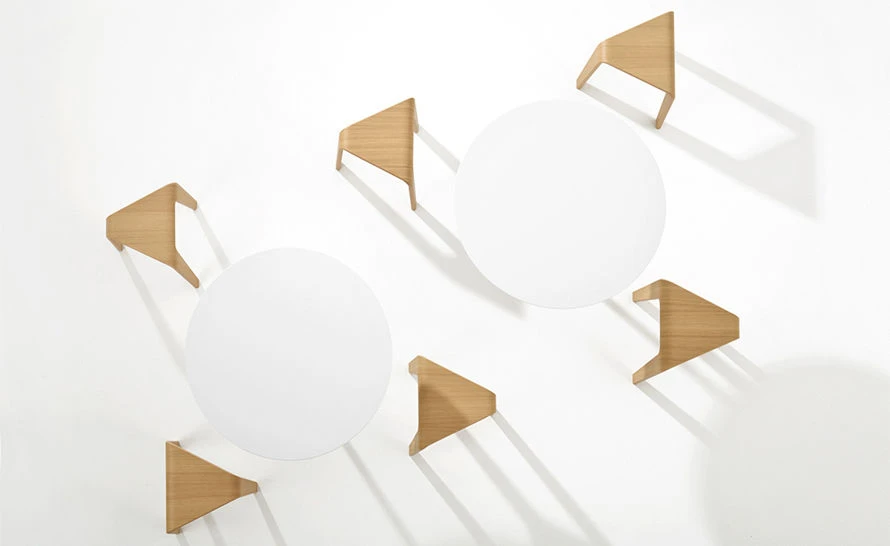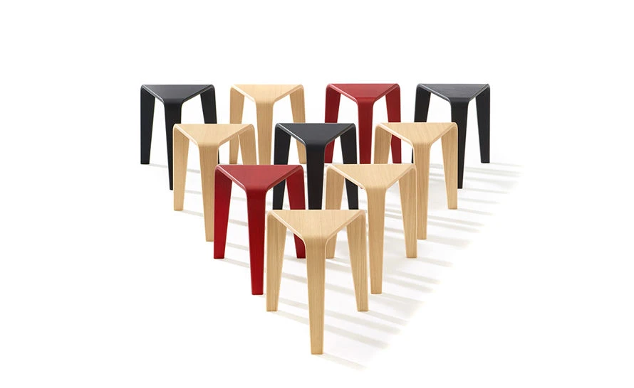 Triangular in form and modular in nature, Ply is a system of low tables and stools rendered in fluid lines of wood. Engineered to create a continuous line from top through legs, its reduced silhouette and warm material complement its dynamic form. Alone or in groups, Ply’s playful geometry of surfaces is like the game of Tangram, shape and color work together to create open compositions. The collection is available in different sizes and heights in oak, black and red finishes.