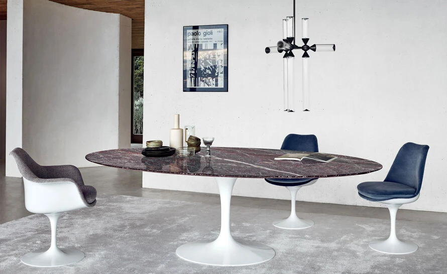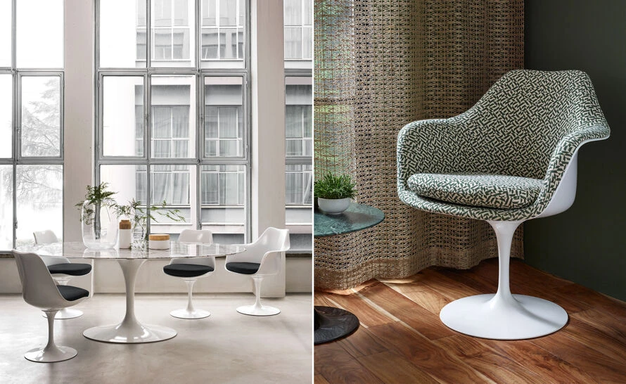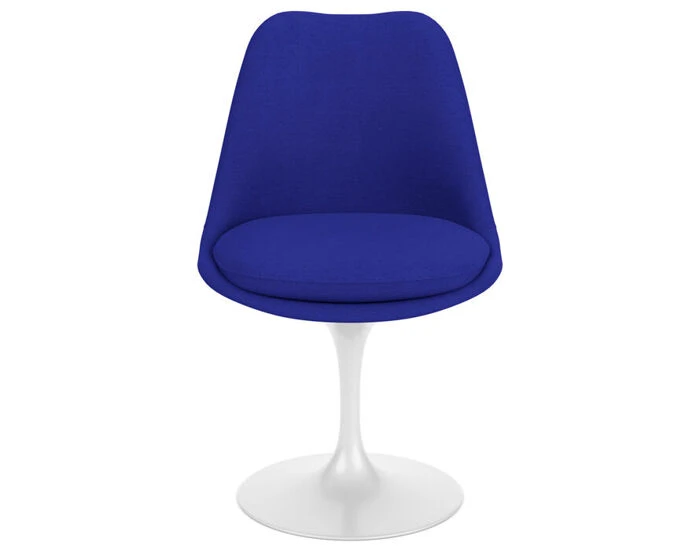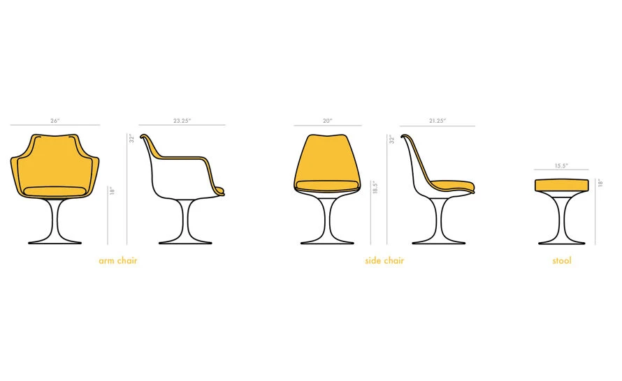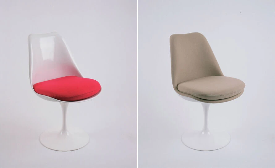 In his purist approach to design, Finnish-born Eero Saarinen sought out the essential idea and reduced it to the most effective structural solution. He designed the 1956 Tulip chair in terms of its setting, rather than a particular shape. “In any design problem, one should seek the solution in terms of the next largest thing.” he said. “If the problem is a chair, then its solution must be found in the way it relates to the room…” In the Tulip, Saarinen realized his ideal of formal unity: “Every significant piece of furniture has a holistic structure.” Winner of the 1969 Museum of Modern Art Award, the Tulip is Saarinen’s genius solution to clearing up the “slum of legs” that populates the under-carriage of most dining sets.