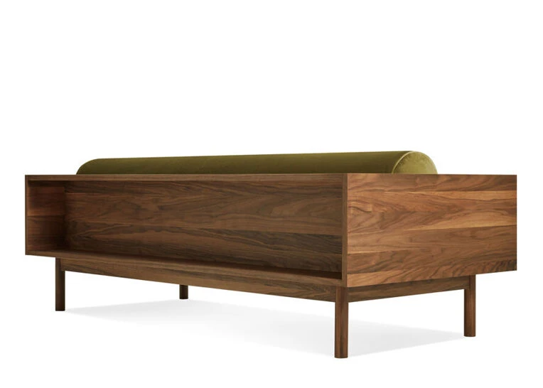 Instant Heirloom. Sofa and bookshelf come together to create an artful display of form and function. Solid wood makes for a dazzling surround while serving as a chic spot to show off your ephemera or rest your martini. A genteel bolster provides ample support and a pleasing vintage vibe without the online auction.