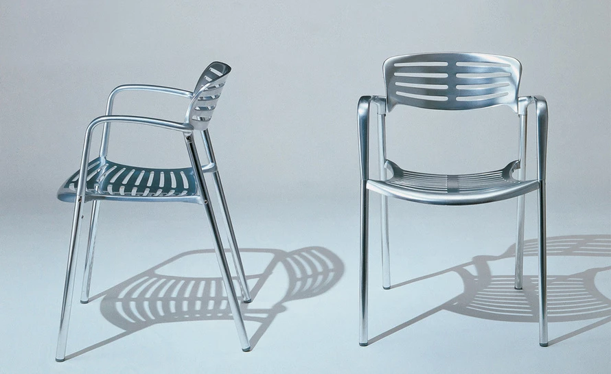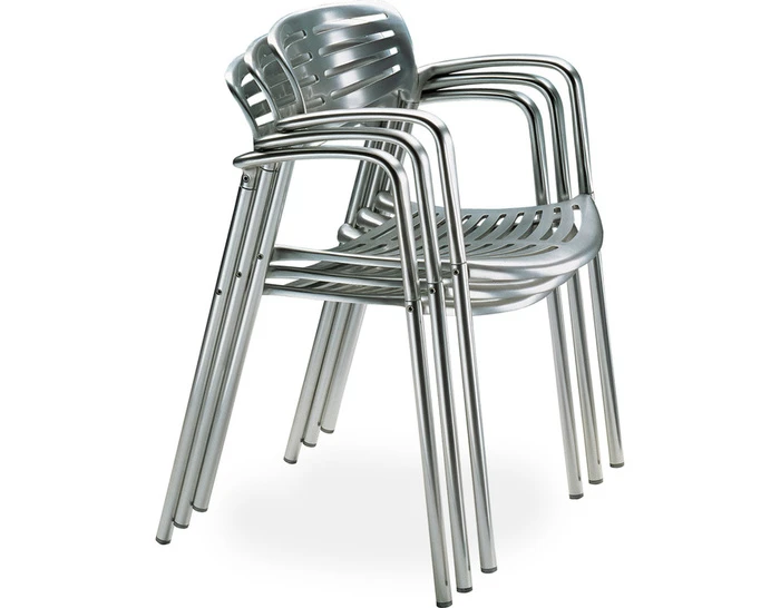 This award winning versatile chair was originally designed for Amat by Jorge Pensi which has since been adopted by Knoll. The chair still bears the stamp of Pensi’s name and “AMAT 3” under the seat. It is just as comfortable outside as it is indoors, and the frame will not reflect extreme outdoor temperatures. The seat, back and arms are thermo-treated polished cast aluminum. The legs are anodized, polished tubular aluminum making the chair completely 100% recyclable. Optional seat cushion available in a variety of upholstery options. As the name implies, the chair can be stacked up to 4 high for compact storage.
