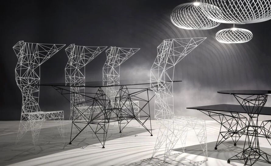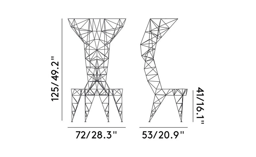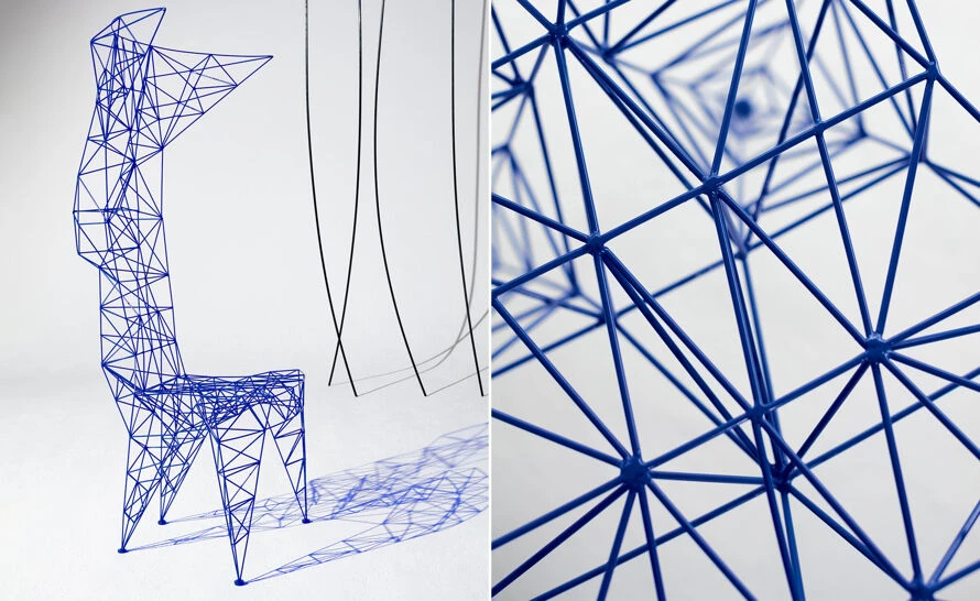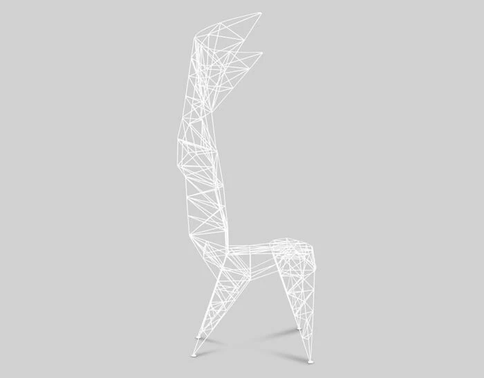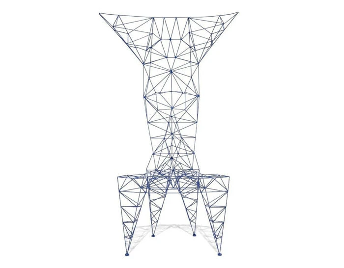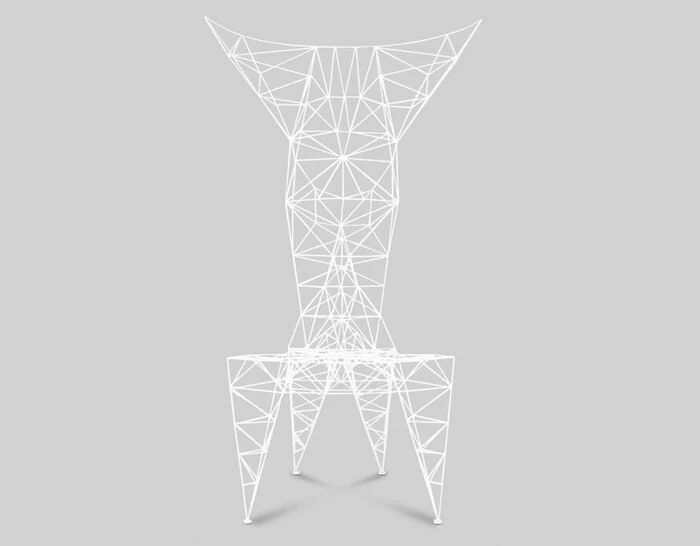 The lattice work of 3mm diameter steel rod is triangulated for maximum strength – an exercise in pure unadorned structure. The original inspirations which ranged from early computer programming, electricity pylons and architectural models of bridges are clearly visible in this joyful exercise in self-taught structural engineering. Now powder coated in white, the Pylon chair, whilst possibly not being the most comfortable chair in the world, is certainly one of the most recognizable and unique.