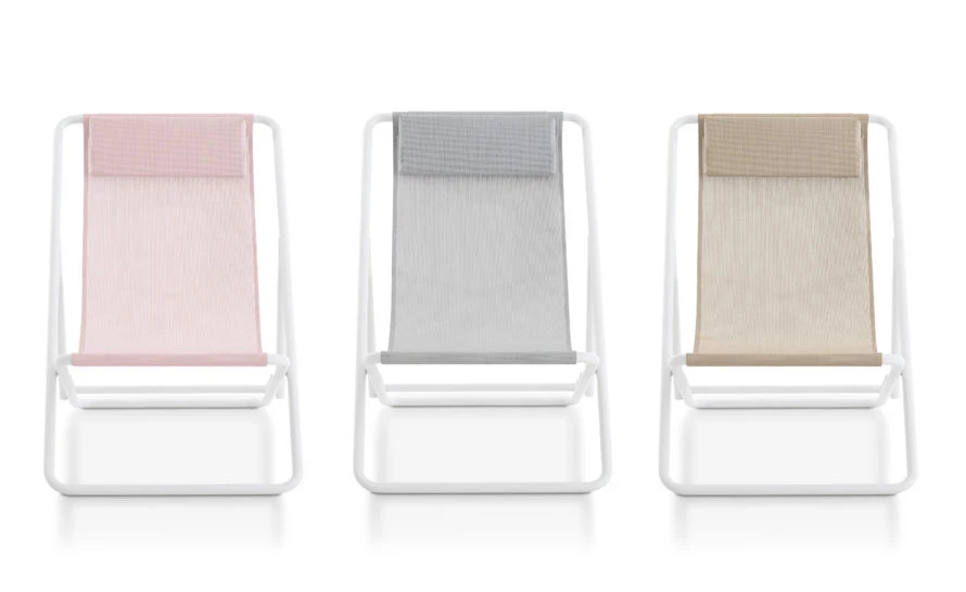 This is the bicolour version, with a white frame and a contrasting sling in the color of your choice. An elegant monochrome version is also available. Trip features soft rounded shapes, thanks to its tubular aluminum structure. If you prefer a more rectilinear profile, check out our Picnic.