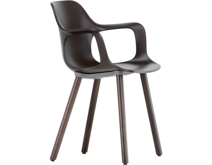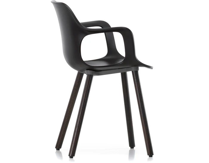 Hal armchair wood features a non-stackable wooden base in natural oak, dark oak or black-pigmented walnut. The connecting element between the shell and base is die-cast aluminum, powder-coated in dim grey. The Hal armchair family is offered in a choice of four base options: tubular steel or wood as well as a five-star base on castors.