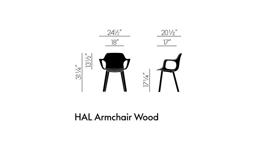 Hal armchair wood: 24.5″ w | 20.5″ d | 31.25″ h | seat: 17.25″ h | 17″ d