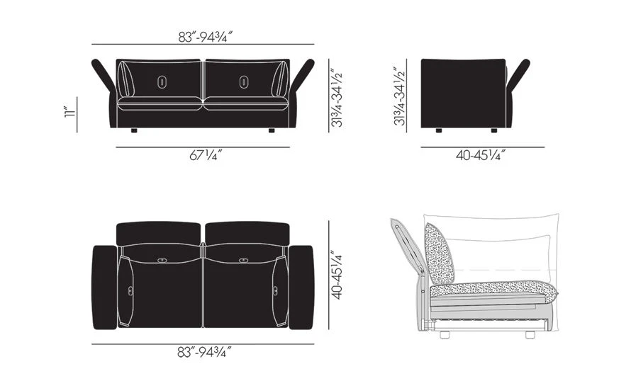 mariposa 2.5 seat sofa: 83″ – 94.75 w | 40″ – 45.25″ d | 31.75″ – 34.5″ h | seat: 16.75″ h