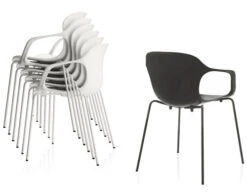 Tip Ton is available in eight colors and stacks four high. The ‘RE’ version is made from recycled polypropylene and is 100% recyclable. Please note that special additives retard the fading of colors due to UV radiation. However, if the chair is exposed to sunlight for prolonged periods, the color may change over time. We recommend limited exposure to sunlight.